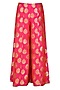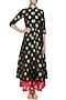 This set features a black high neck brocade kurta in banarasi base with gold printed motifs on the front and back. It is paired with red and gold banarasi palazzo pants.