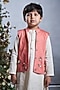 Featuring a peach nehru jacket for boys in cotton base. It is paired with a kurta and pants. Style it with juttis and a watch for a festive occasion or wedding ceremony