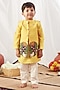 Featuring a yellow pichwai kurta for boys in cotton base with motif detail. It is paired with pants. Accessorise it with pair of mojaris and a watch for a stylish ensemble, ideal for festive occasions or haldi ceremony.