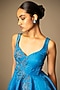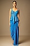 Featuring a blue peplum corset in bemberg linen satin base with embellishments. It is paired with silk crepe draped skirt. Accentuate with statement jewellery and heels for festive occasions, cocktail events or wedding functions.