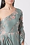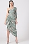 Featuring a mint one-shoulder draped dress in organza satin base with a gathered sleeve and floral print.