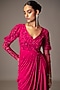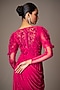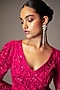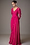 Featuring a pink gown saree in georgette base with v-neck, floral work, sequins, beads 3D embellishments. Accentuate it with statement earrings and heels for a cocktail party, engagement or sangeet ceremony.