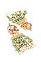Featuring a gold finish long layered necklace studded with green beads and gold gemstones, set in mixed metal. It is paired with a matching pair of chandelier earrings. Perfect choice for weddings, parties and for other Indian festivities.