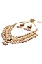 Featuring a gold finish necklace studded with kundan polki, pearls and red gemstones, set in mixed metal. It is paired with a matching pair of earrings. Perfect choice for weddings, parties and for other Indian festivities.
