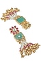 Featuring a gold finish long layered necklace studded with floral motifs, pearl, maroon and green beads, set in mixed metal. It is paired with a matching pair of jhumka earrings. Perfect choice for weddings, parties and for other Indian festivities.
