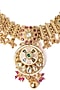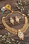 Featuring a gold finish floral pendant necklace studded with pink and green stones, set in mixed metal. It is paired with a matching pair of earrings. Perfect choice for weddings, parties and for other Indian festivities.