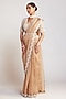 Featuring a beige saree in organza base with pearl embellishment. It is paired with a contrasting georgette blouse having a v-neckline.