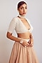 Featuring a beige lehenga in organza base with pearl embellishment. It is paired with a contrasting ivory georgette blouse and an organza dupatta. Accentuate this statement lehenga with a pair of heels and statement jewellery for your wedding/sangeet/engagement/trousseau look.