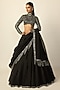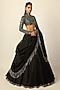 Vvani by Vani Vats presents a black lehenga in georgette base. It is paired with an embroidered blouse having an zero neckline and an organza dupatta having silver tassels detailing. Accentuate it with an emerald choker necklace, a potli bag and block heels for a wedding or engagement ceremony.