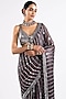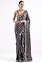 Featuring a charcoal grey pre-draped saree in georgette base with hand-cut mirror embellishments. It is paired with a matching satin organza metallic blouse.