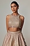 Featuring a deep beige lehenga in georgette base with gota embroidery. It is paired with a deep beige crop top. Accentuate the designer lehenga with statement jewellery and heels for your wedding or engagement ceremony.