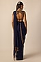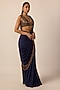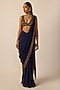 Vvani by Vani Vats presents a deep blue draped saree in georgette base with cascading tassels detailing. It is paired with a V-neck blouse having hand-cut mirror and cutdana embroidery. Accentuate it with an emerald choker necklace, a potli bag and block heels for a wedding or engagement ceremony.