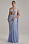 Vvani by Vani Vats presents a dew blue draped saree in georgette base with cascading pearl tassels embroidery. It is paired with a mirror embroidered blouse. Style it with minimal diamond jewellery, sleek heels, and a clutch, suited for reception or cocktail events.