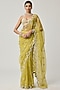 Featuring a fern green saree in organza base with pearl and mirror embroidery. It is paired with a georgette embroidered blouse. Style it with diamond earrings, a clutch bag and nude heels. Perfect for festive celebrations like Diwali, Bhai Dooj, engagement ceremonies, mehendi, or cocktail nights.
