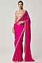 Featuring a fuchsia pink saree in satin bas with mirror embroidery. It is paired with a georgette embroidered blouse. Style it with diamond earrings, a clutch bag and nude heels. Perfect for festive celebrations like Diwali, Bhai Dooj, engagement ceremonies, receptions, or cocktail nights.
