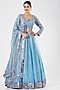 Featuring an ice blue lehenga in organza base with embroidery. It is paired with a matching georgette blouse and a dupatta. Accentuate this statement lehenga with a pair of heels and statement jewellery for your wedding/sangeet/engagement/trousseau look.
