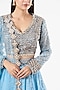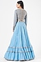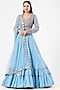 Featuring an ice blue tiered lehenga in georgette base. It is paired with a matching blouse and a net dupatta. Accentuate this statement lehenga with a pair of heels and statement jewellery for your wedding/sangeet/engagement/trousseau look.