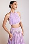 Featuring a lilac lehenga in georgette base with pearl embellishment. It is paired with a matching blouse having a halter neckline and pearl drop detailing. Accentuate this statement lehenga with a pair of heels and statement jewellery for your wedding/sangeet/engagement/trousseau look.