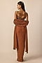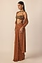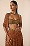 Vvani by Vani Vats presents a metallic copper pencil skirt in georgette base with single drops detailing. It is paired with a blouse hand-cut mirror embroidery and a stole. Accentuate it with zircon dangler earrings and metallic heels for festive occasion, sangeet or cocktail nights.