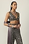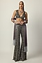 Vvani by Vani Vats presents a metallic grey blouse in georgette base with a V-neckline, cutdana and mirror embroidery. It is paired with net sharara pants and a satin stole. Accentuate it with an emerald choker necklace, a potli bag and block heels for a wedding or engagement ceremony.