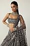 Vvani by Vani Vats presents a metallic grey lehenga in organza base with embroidery. It is paired with a georgette mirror embroidered blouse and a net dupatta. Accentuate it with an emerald choker necklace, a potli bag and block heels for a wedding or engagement ceremony.