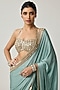 Featuring a powder blue saree in satin base with mirror hand embroidery. It is paired with a georgette embroidered blouse having a halter neckline. Style it with diamond earrings, a clutch bag and nude heels. Perfect for festive celebrations like Diwali, Bhai Dooj, engagement ceremonies, receptions, or cocktail nights.
