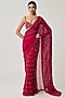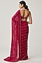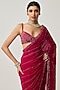 Featuring a ruby red saree in georgette base with crystal embroidery in linear pattern. It is paired with an embroidered sleeveless blouse. Style it with diamond earrings, a clutch bag and nude heels. Perfect for festive celebrations like Diwali, Bhai Dooj, engagement ceremonies, receptions, or cocktail nights.