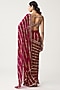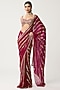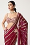 Featuring a ruby red saree in georgette base with mirror hand embroidery in linear pattern. It is paired with an embroidered sleeveless blouse. Style it with diamond earrings, a clutch bag and nude heels. Perfect for festive celebrations like Diwali, Bhai Dooj, engagement ceremonies, receptions, or cocktail nights.