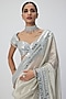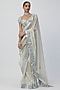 Featuring a silver saree in banarasi shimmer organza base. It is paired with a blouse having hand-cut mirror embroidery. Accentuate it with statement earrings and heels for weddings or engagement ceremonies.