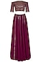 Featuring a wine off shoulder blouse in georgette base with sequins hand embroidery. It is paired with matching sharara pants and dupatta.