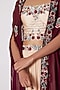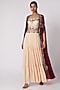 Featuring a wine cape for girls in viscose georgette base with aari and thread hand embroidery. It is paired with a contrasting peach corset style crop top in dupion silk base and tiered skirt having waist belt.