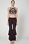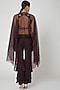 Featuring a wine high-low cape in organza base with sequins embroidery. It is paired with matching georgette tiered pants and a crop top.