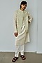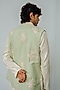 Featuring a mint indowestern jacket in chanderi base with applique work and resham embroidery. It is paired with a kurta and pants. Perfect wear for engagement or festive occasions.