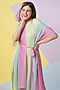Let there be sparks with this sorbet pastel color block kaftan. Featuring here is our seafoam, lettuce green, and lavender color pleated crepe kaftan with a satin slip and lavender belt.