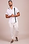 Featuring a white shirt in linen base with open collar, buttons, black vertical stripe detailing, and short sleeves. This contains only one piece.