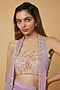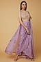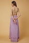 Featuring an orchid purple blouse in pure chinnon silk and net base with patchwork hand embroidery. It is paired with a matching draped skirt and a contrasting gold hand embroidered jacket.