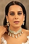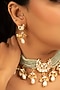 Featuring a gold finish choker necklace studded with kundan polki and pearls, set in brass. It has a push back closure. It is paired with a matching pair of earrings. Perfect for wedding celebrations, festive soirees or cultural gatherings adding a regal charm to every look.