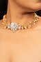 Featuring a gold finish necklace studded with kundan polki, moissanite stones and pearls, set in brass. It has a push back closure. Perfect for wedding celebrations, festive soirees or cultural gatherings adding a regal charm to every look.