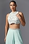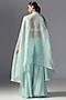 Featuring an aqua sleeveless blouse in raw silk base with embroidery. It is paired with chiffon palazzo pants and an organza cape. Accentuate with statement earrings and heels for festive occasion or wedding ceremonies.