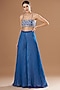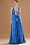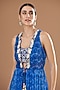 Featuring a blue jacket in shibori base with print. It is paired with an embroidered bustier and palazzo pants. Accentuate with statement jewellery and heels for a festive occasion or sangeet ceremony.