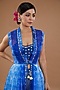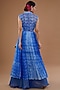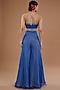 Featuring a blue jacket in chiffon, organza and raw silk base with shibori print. It is paired with a bustier and palazzo pants. Style it with statement dangler earrings and heels for the perfect look at a cocktail or engagement ceremony.