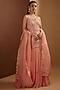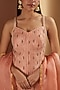 Featuring a brick kurta in organza, raw silk and net base with boota and dori work. It is paired with matching sharara pants and a dupatta.