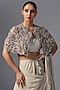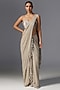 Featuring a dark vanilla saree in chiffon base. It is paired with a raw silk bustier and an embroidered jacket. Accentuate with statement earrings and heels for festive occasion or wedding ceremonies.