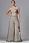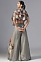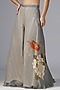 Featuring a dull blue top in organza base with print. It is paired with chiffon palazzo pants and a raw silk bustier. Accentuate with statement earrings and heels for festive occasion or wedding ceremonies.