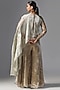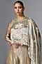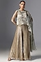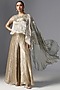 Featuring a gold jumpsuit in tissue base with an attached embroidered cape. Accentuate with statement earrings and heels for festive occasion or wedding ceremonies.