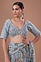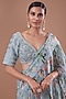 Featuring a light blue pre-stitched frilled saree in chiffon base with print. It is paired with a raw silk embroidered blouse. Accentuate it with statement jewellery and heels for a festive occasion or engagement ceremony.