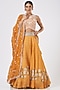 Featuring an orange lehenga in raw silk base with floral print. It is paired with a matching embroidered blouse and a dupatta.