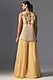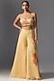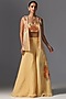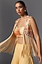Featuring a peach jacket in raw silk base with print and embroidery. It is paired with chiffon palazzo pants and a bustier. Accentuate with statement earrings and heels for festive occasion or wedding ceremonies.