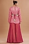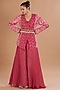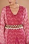Featuring a pink jacket in shibori base. It is paired with raw silk and chiffon palazzo pants, including an embroidered belt. Style this with hoop earrings and heels for a complete look.