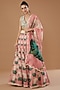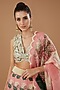 Featuring a pink lehenga in organza base with print. It is paired with a raw silk blouse and an embroidered dupatta. Perfect for weddings and festive occasions, showcasing style and sophistication.
